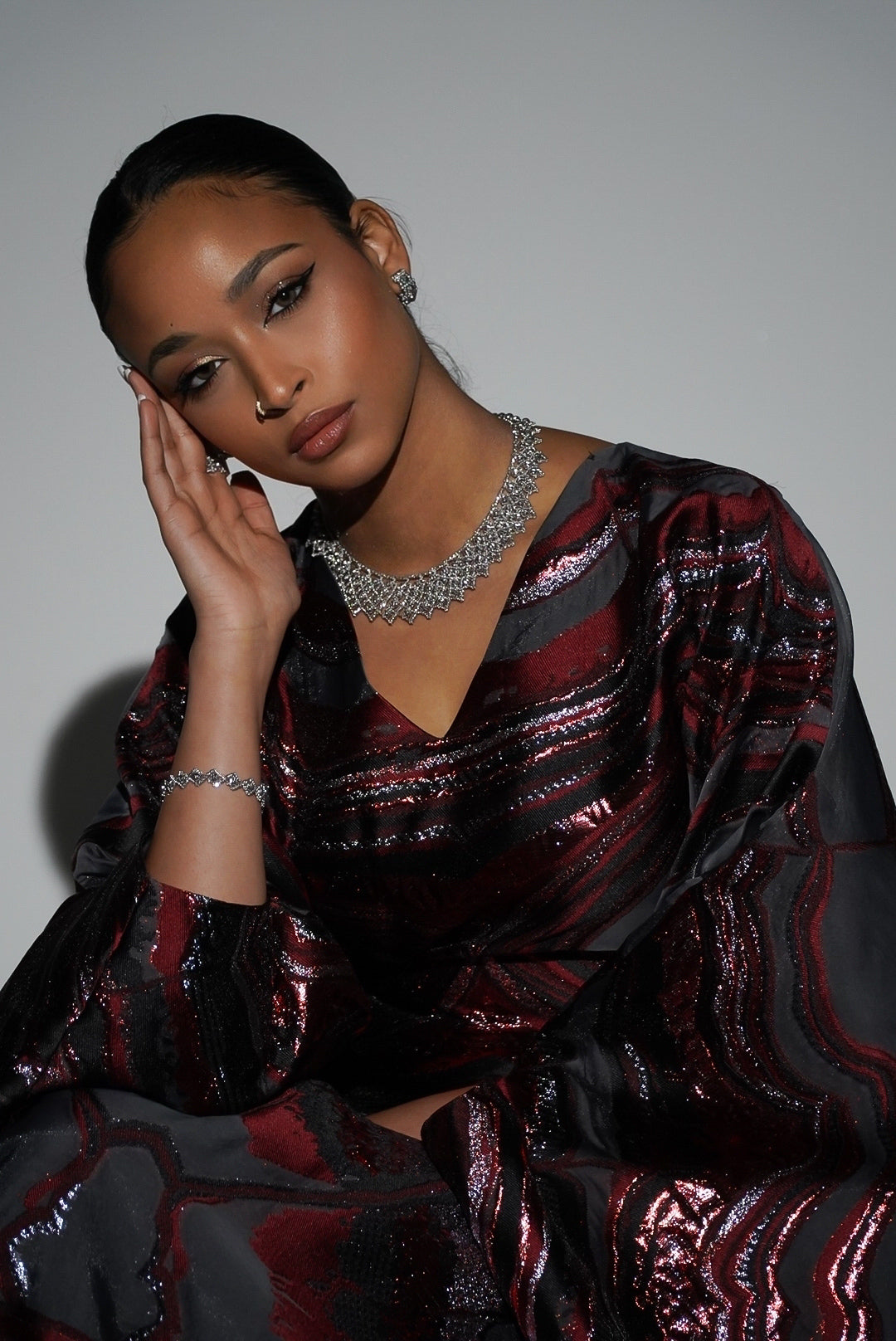 Luminous gold lurex detailing threads throughout the design, catching light gracefully and adding precious metallic accents that enhance the garment's inherent luxury. Constructed from premium pure silk organza, the fabric drapes with exceptional fluidity and movement, offering the refined aesthetic that discerning wearers seek. The silk lining ensures superior comfort and durability while maintaining the piece's elegant silhouette and structural integrity.