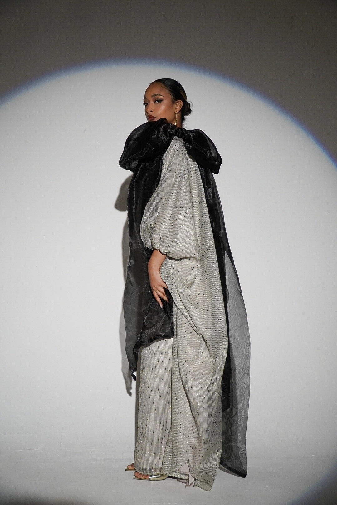 HAYZO silk organza with gold lurex and black thread detailing presents a sophisticated choice for those seeking refined elegance. This piece features exquisite craftsmanship, combining lustrous silk organza with metallic gold lurex accents and precise black thread embellishments that create visual depth and dimension.