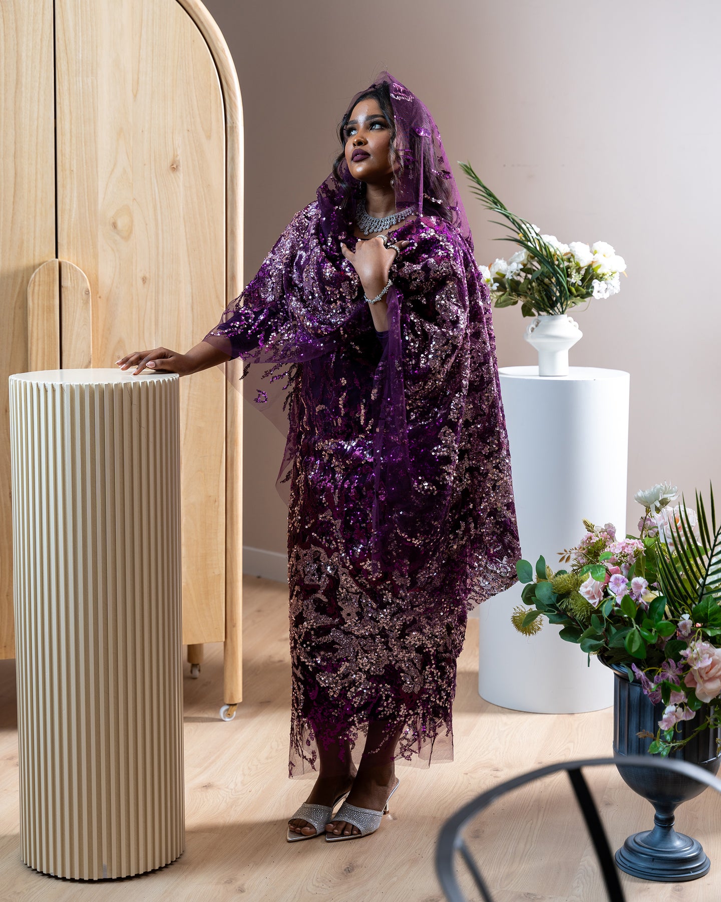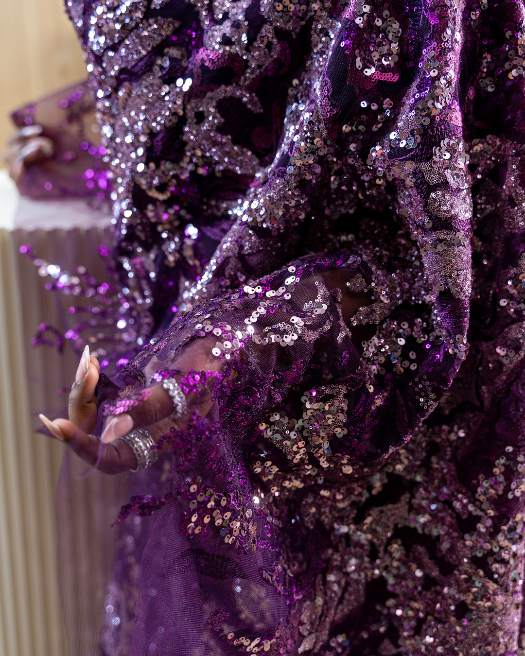 Dark plum purple tulle base with embroidery and sequin detailing in shades of magenta, purple and silver.